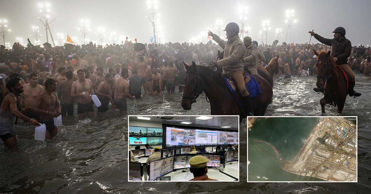 একটি স্যাটেলাইট চিত্রে কুম্ভ মেলা উৎসবের সময় যমুনা নদীর তীরে জনসমাগম দেখা যাচ্ছে, যা ১৭ জানুয়ারি, প্রযাগরাজ, ভারত থেকে তোলা হয়েছে। —রয়টার্স ভারতীয় ধর্মীয় উৎসবগুলোর মধ্যে প্রাণঘাতী জনসমাগম একটি পরিচিত বৈশিষ্ট্য, এবং কুম্ভ মেলা, যার অপরিসীম ভক্তদের ভিড় রয়েছে, একটি শোকজনক ইতিহাসের অধিকারী স্ট্যাম্পিডের জন্য।