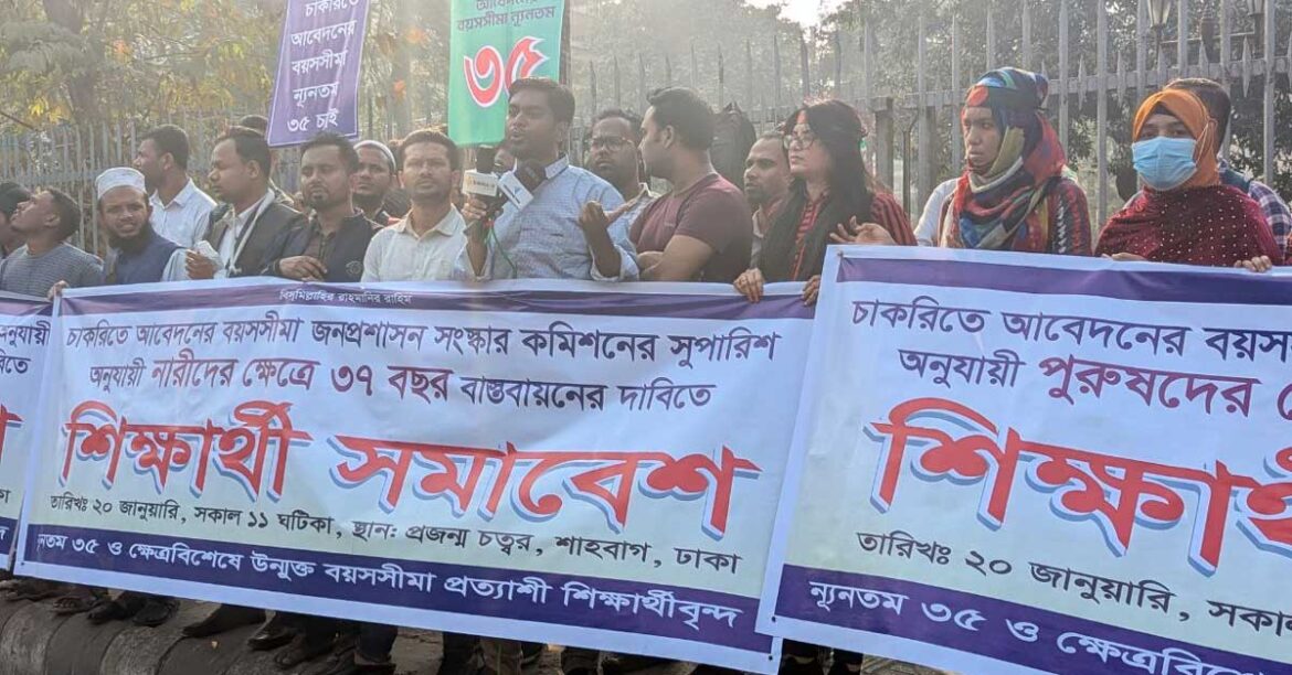 চাকরিতে প্রবেশের বয়সসীমা ৩৫ করার দাবিতে রাজধানীর শাহবাগে জাতীয় জাদুঘরের সামনে সোমবার (২০ জানুয়ারি) সকাল ১১টায় শান্তিপূর্ণ সমাবেশ করেছেন চাকরিপ্রত্যাশীরা। তারা ঘোষণা দিয়েছেন, দাবি আদায় না হওয়া পর্যন্ত শাহবাগ ছাড়বেন না।